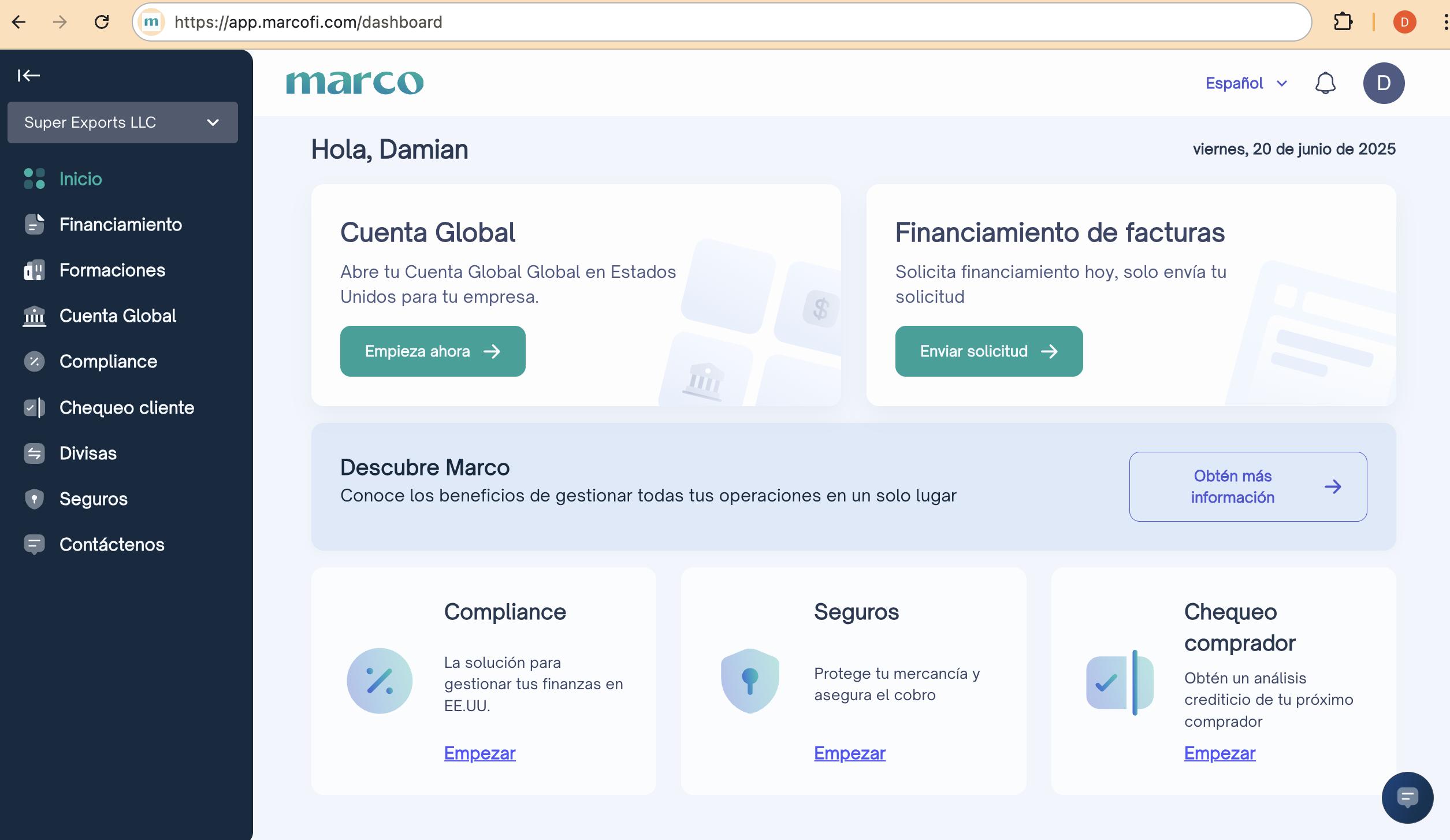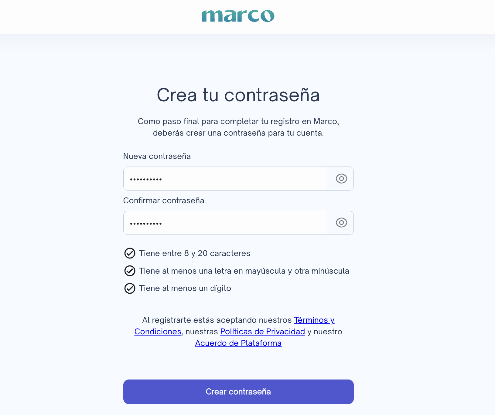 Esta guía describe los pasos para crear una cuenta con usuario y contraseña para tu empresa en la plataforma de Marco.