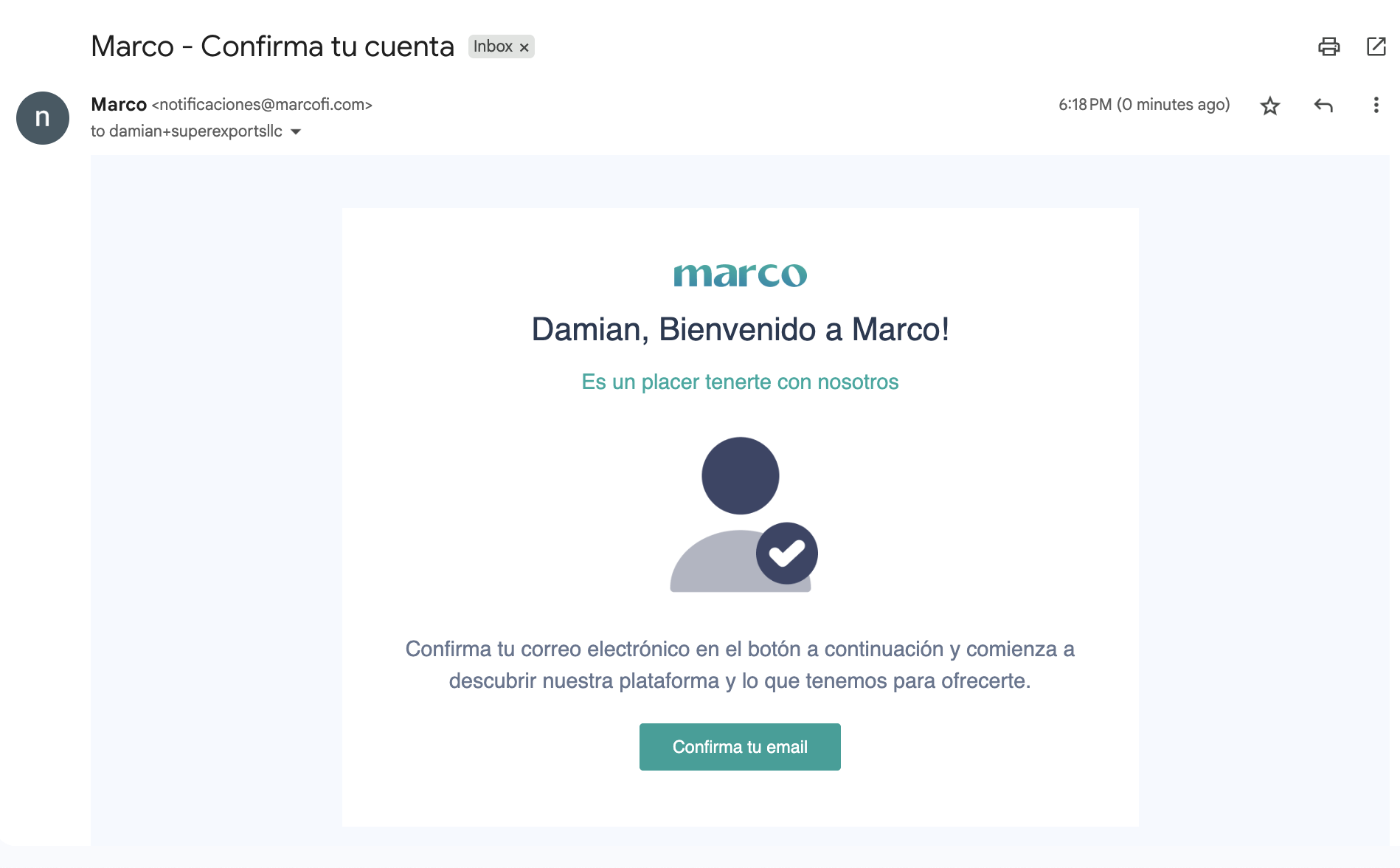 Chequea tu casilla de correo y abre el email “Marco - Confirma tu cuenta” enviado desde notificaciones@marcofi.com